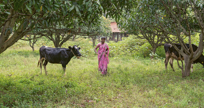Meghana vit avec son mari et ses deux enfants à Avverahalli, petit village du sud de l’Inde à quelque 25 kilomètres de Bangalore, la métropole indienne de l’informatique. En tant que travailleuse journalière, elle n’a longtemps eu qu’un revenu irrégulier. Elle a décidé d’y remédier en achetant une vache et en se lançant dans la production de lait. Celle de l’Inde, forte d’un programme de soutien étatique, est actuellement l’une des plus importantes au monde. L’or blanc vient de petites productrices et petits producteurs, dont Meghana fait partie. Mais où trouver les fonds pour acquérir l’animal?