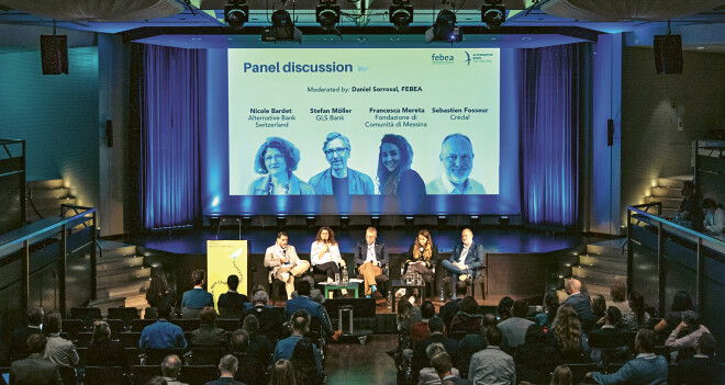 Pedro M. Sasia Santos, président de la FEBEA, a rappelé dans son discours de bienvenue que dans la nouvelle course à l’armement, les responsables politiques semblent ignorer que la menace qui pèse sur nos moyens de subsistance n’est pas que militaire. Les changements climatiques ont aussi des conséquences effrayantes pour notre avenir. Les inégalités sociales représentent un autre défi planétaire. Les 33 banques, fondations et institutions financières de 17 pays européens regroupées dans la FEBEA souhaitent lutter contre cela, a poursuivi Pedro M. Sasia Santos. Le secteur financier durable a fait preuve de sa rentabilité, de sa résilience et de sa vitalité, malgré un fort vent contraire qui souffle dans le monde politique. «Ne cédons pas au rejet: montrons plutôt quelles alternatives existent», a martelé le président de la FEBEA aux 150 participant-e-s. Les droits de la personne et l’inclusion – en particulier celle des pans vulnérables de la société – sont à l’ordre du jour. Les banques éthiques, avec leur politique d’octroi de crédits, jouent un rôle charnière important entre l’économie et la société.